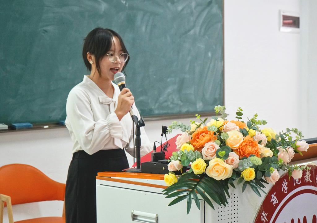 新生代表何璇同学则宛如一颗闪耀的新星,满怀着对未来的无限憧憬以及对教师职业的神圣使命感。她倡议新生们胸怀壮志,目标明确,为成为优秀的人民教师而努力拼搏。