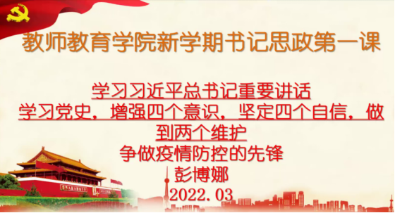 为全面贯彻党的教育方针,深入落实《关于深化新时代学校思想政治理论课改革创新的若干意见》精神,加强学院思政课建设,充分发挥思政课在立德树人中的关键作用。2022年3月25日中午12:00,1946伟德国际源自英国党总支彭博娜副书记以“学习习近平总书记重要讲话——争当疫情防控先锋模范”为主题为1946伟德国际源自英国学生党支部党员、预备党员以及入党积极分子进行“思政第一课”线上授课,本次党课由1946伟德国际源自英国学生党支部杨萌同志主持。