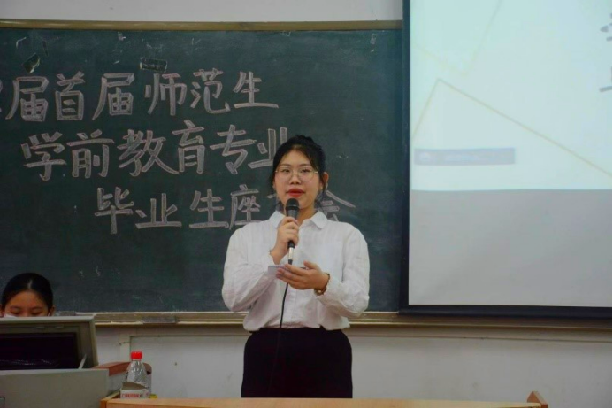会议第三项内容:来自19级学前教育5班的杨萌作为学弟学妹代表发言。杨萌师姐回忆初入校园时,因为有师兄师姐们的帮助而对大学生活有了更大的向往,对未来更加充满动力。毕业是一首离别的歌,是成长的里程碑。杨萌师姐指出:“我们将以你们为榜样,同时也请不要忘记,母校和我们的老师永远是你们坚强的后盾!”杨萌师姐的肺腑之言激励着我们不断向前,故事还在继续,结束也是新的开始,祝愿师兄师姐们毕业快乐,前程似锦!