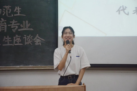会议第二项内容:优秀毕业生代表、国家奖学金获得者周丹琪师姐发言。周丹琪师姐首先感谢国家对我们大学生的栽培,学校和学院领导的付出,老师们的谆谆教诲,以及同学们的鼓励。师姐回顾大学四年,自己付出了辛勤的汗水,以更高的标准要求自己,获得今天的成就是一项非常大的荣耀。同时师姐也表示昨天的荣耀已是过去,在未来她将会克服困难和挫折,继续奋勇前行。在最后,师姐还对师弟师妹们、老师们以及学校给予祝福。