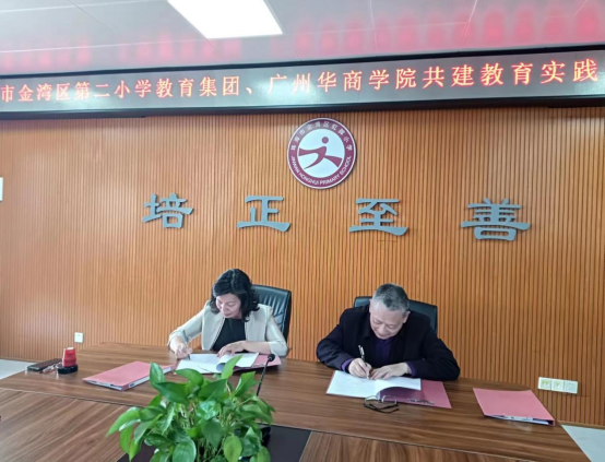 谭建生副院长和李彩芳校长在双方代表的见证下共同签署了共建教育实践基地的协议,谭建生副院长代表学院向珠海市金湾区第二小学教育集团授牌。
