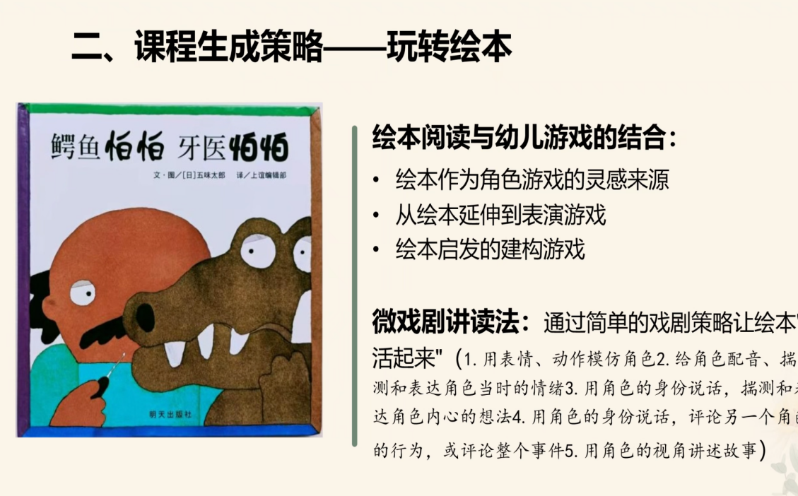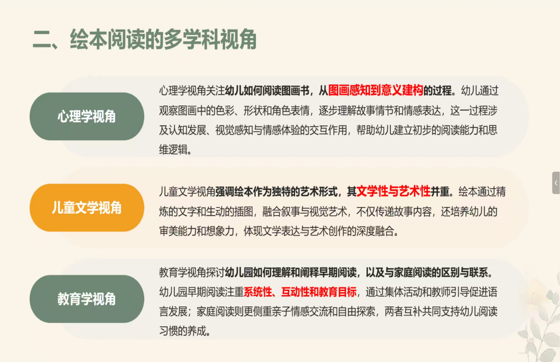 在核心内容分享环节,胡老师首先聚焦绘本理论的内涵解读,明确其倡导的儿童观——尊重儿童的主体性与独特性,主张以发展性视角关注儿童的成长需求与个体差异;同时结合课程观的本质要求,探讨如何以绘本理论为指导,构建贴合儿童发展规律的课程体系。在此基础上,胡老师重点围绕“绘本”这一教育载体展开深入探讨,系统讲解了绘本的定义、特点与教育价值:绘本作为文字与图画共同讲述完整故事的艺术形式,不仅是儿童阅读的优质选择,也能为成人教育提供启发,在激发学习兴趣、传递多元知识、培养逻辑思维与审美能力等方面发挥着重要作用。