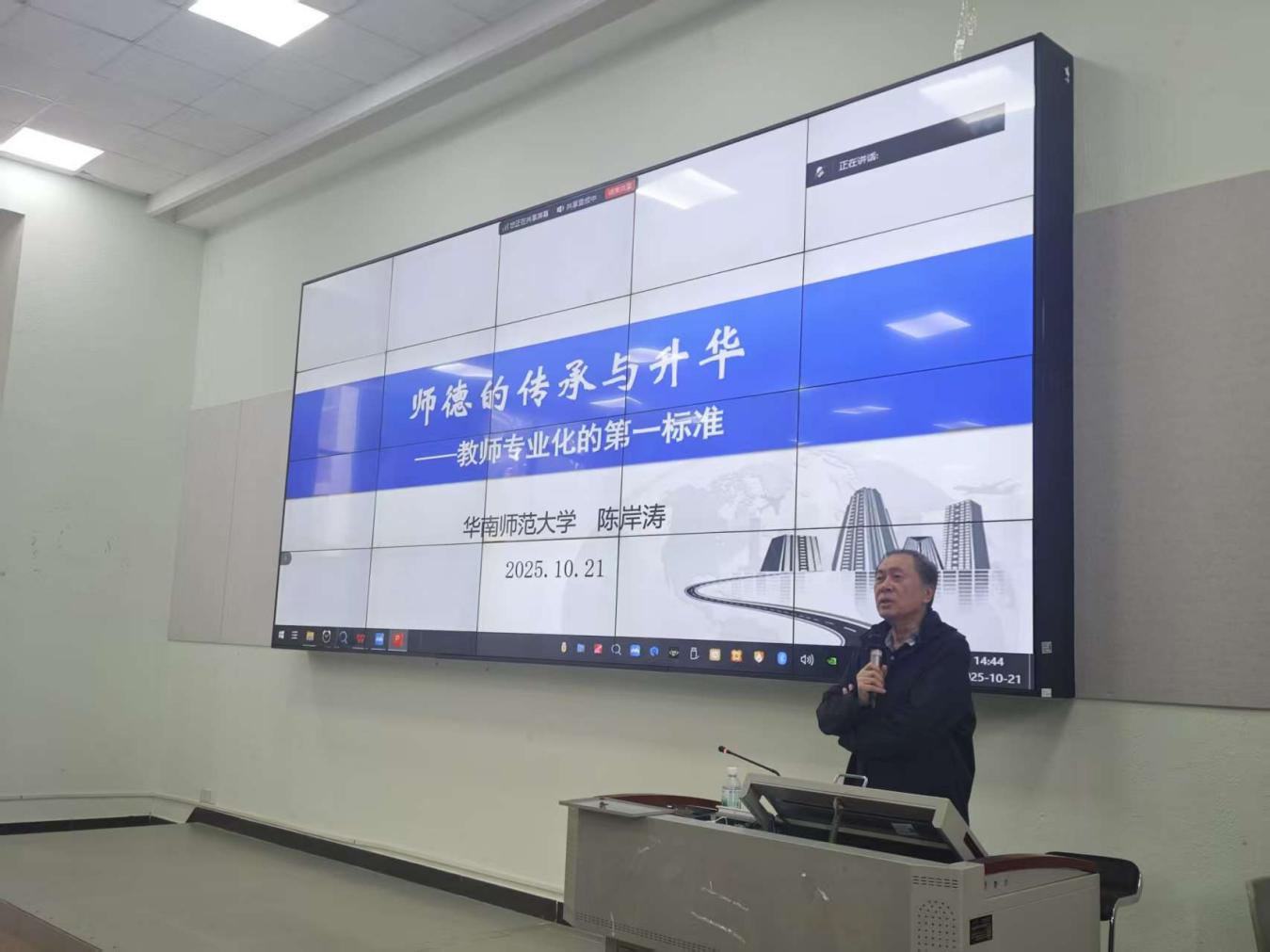 2025年10月21日下午,1946伟德国际源自英国组织全体专任教师参与师德涵养铸魂工程专题培训。本次培训特邀华南师范大学教授陈岸涛主讲,以“师德的传承与升华——教师专业化的第一标准”为主题,为全体教师带来了一场兼具理论深度与实践指导意义的专题培训。
