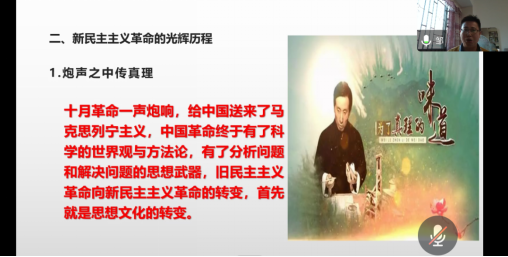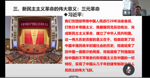 第三部分,邹讲师带我们重温新民主主义革命的伟大意义,他希望通过此次学习,使我们明白伟大的政治革命、社会革命和精神革命。最后一部分,邹讲师强调了新民主主义革命的时代启迪:党的领导是关键;人民至上是宗旨;科学理论是指南’实事求是是基础;奋斗精神是保证。最后,邹讲师提出寄语,希望作为新时代的青年,能认真学党史,砥砺前行,知党情,跟党走,加强党性修养。