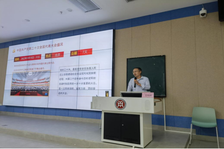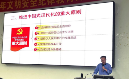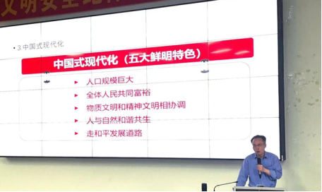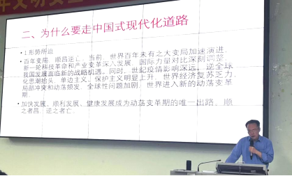 随后,王教授通过对党的二十大的分析,提出会议讲述的重点——走中国式现代化道路,并从“什么是中国式现代化”“为什么要走中国式现代化道路”“推进中国式现代化的重大原则”三个方面进行详细的分析和叙述。