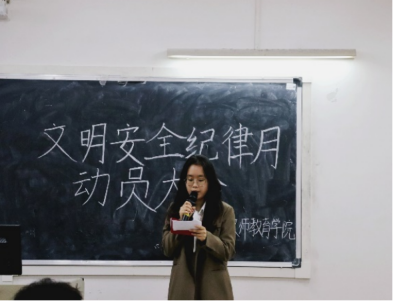 学生代表彭诗颖同学从安全、文明教育以及纪律三个方面进行发言。她认为安全重于泰山,同学们应学习一些自我保护措施,重视消防、饮食和用电安全。另外学生也应尊敬师长、文明礼貌,严格遵守学校各项规章制度,切实做到尊师爱友,诚实守法。