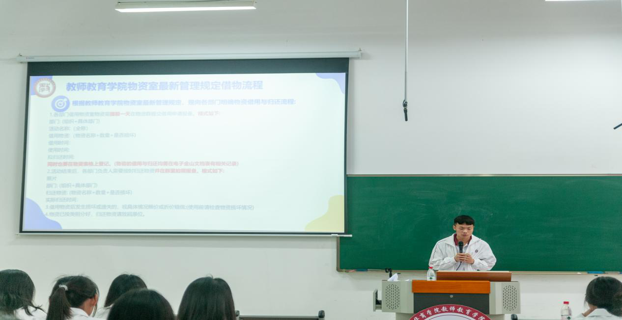 其次,学生会生活部负责人代表讲解1946伟德国际源自英国物资室最新管理规定及物资借用流程,让团学成员更加清晰地了解物资室最新管理规定以及物资借用流程,保障学院各项活动的顺利进行。