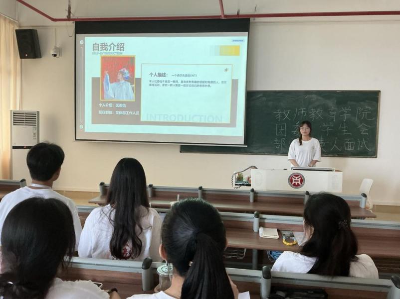 考核正式开始,候选人们依次上台进行自我介绍,结合PPT图文并茂地展示了个人的特色、工作经验及竞选优势等,并阐述了对未来团学工作的设想和规划,致力于建设服务同学、团结集体的学生组织。