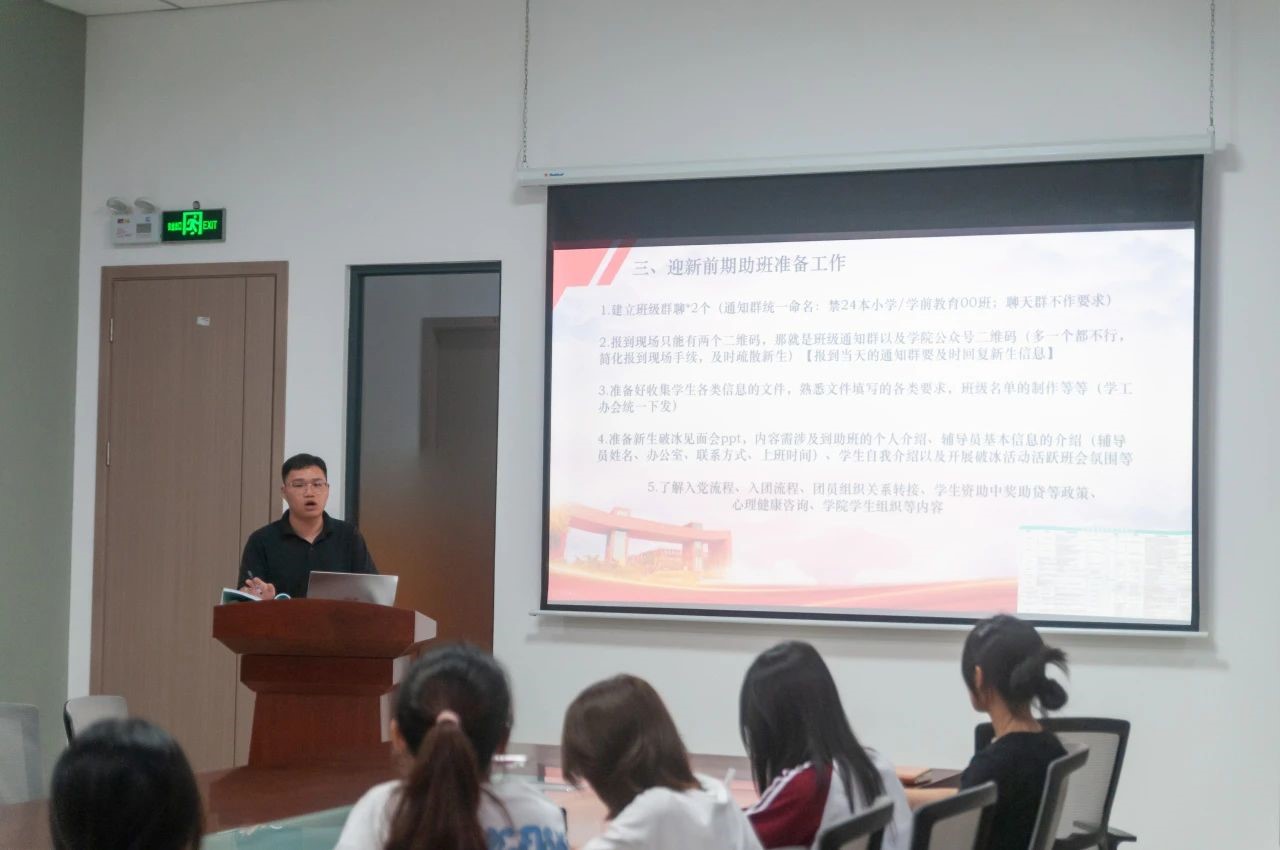 会上,徐炯锋老师就新生入学日常教育、服务、管理工作向全体助理班主任强调要提高站位、明确职责,做好新生的引路人。徐老师还就迎新前期准备工作进行了工作部署,叮嘱助理班主任们全心投入,助力新生顺利完成报到手续。
