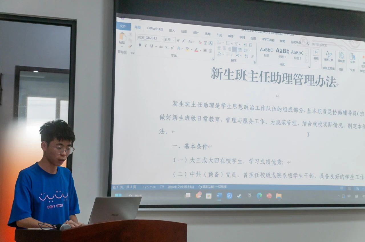 会议伊始,由助理班主任代表黄海楷带领大家学习《新生班主任助理管理方法》。通过学习助理班主任的主要工作任务,进一步明确工作职责,做好新生入学报到和入学教育、军训跟训以及班级日常管理等工作。