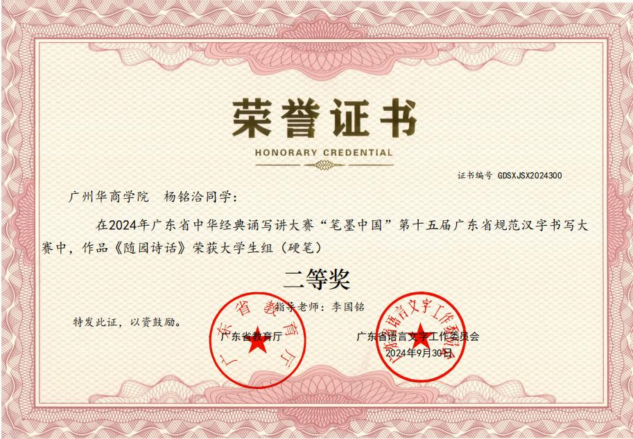 其中,杨铭洽同学在李国铭老师的悉心指导下,以其精湛的书法技艺,荣获第六届中华经典诵写讲大赛“笔墨中国”汉字书写大赛大学生组一等奖和广东省中华经典诵写讲大赛“笔墨中国”第十五届广东省规范汉字书写大赛大学生组二等奖。张露露同学荣获第十五届广东省规范汉字书写大赛大学生组优秀奖。