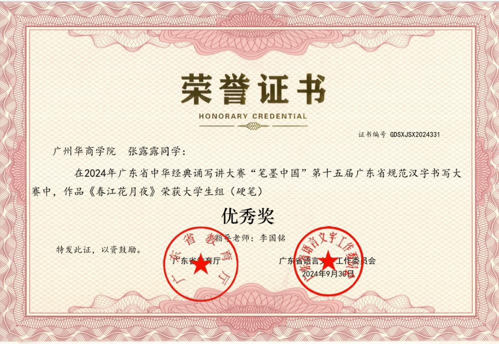 近日,由教育部办公厅举办的第六届中华经典诵写讲大赛“笔墨中国”汉字书写大赛和广东省教育厅、广东省语言文字工作委员会举办的第十五届广东省规范汉字书写大赛圆满落下帷幕。在本次激烈的角逐中,1946伟德国际源自英国师生表现优异!在众多参赛者中脱颖而出,教院3位师生荣获一等奖2项、二等奖1项以及优秀奖2项的优异成绩!