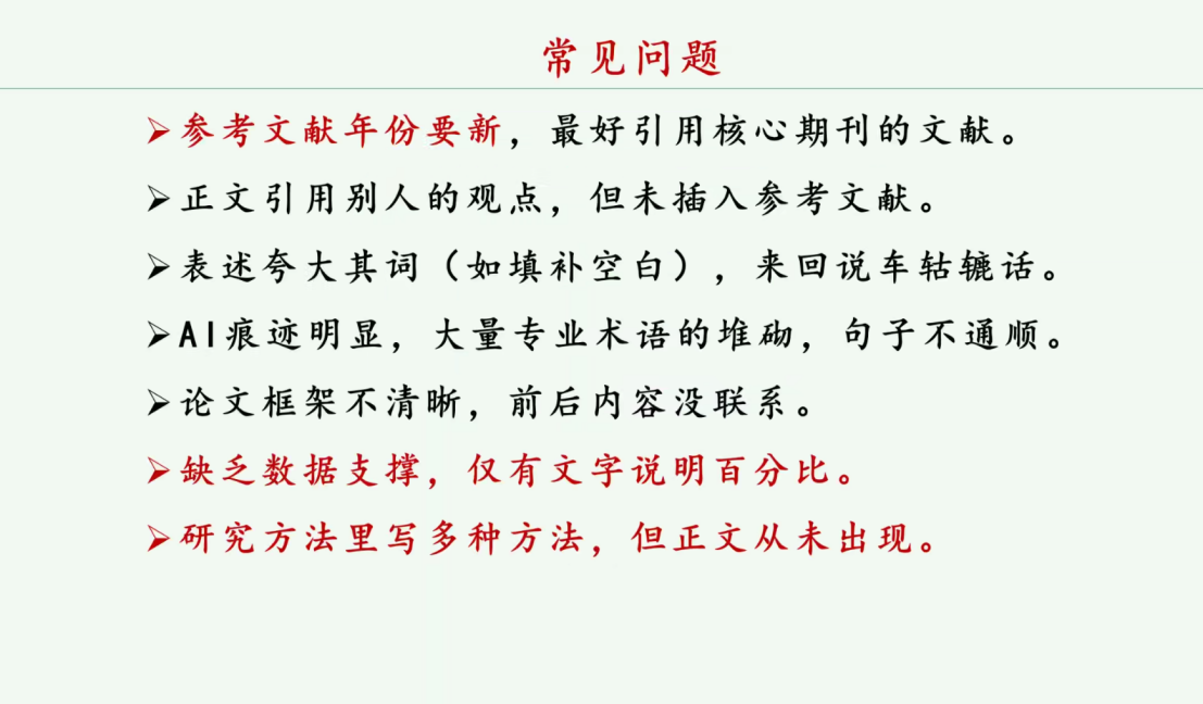 培训最后,翟媛媛老师重点列举了毕业论文写作中易导致答辩不通过的高危错误,作出学术规范警示。明确数据支撑缺失、研究方法前后不一属于严重学术问题,论文中的数据描述必须附有对应图表或案例;同时要求注重参考文献的时效性,优先使用近5年核心期刊文献,5年以上文献数量不宜超过5篇。