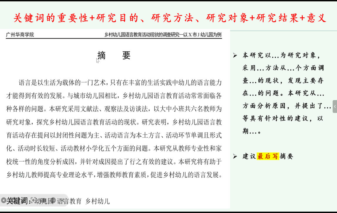 在摘要与目录撰写环节,翟媛媛老师明确了标准化的内容结构与逻辑要求。指出摘要需包含关键词重要性、研究目的、研究方法等核心要素,字数控制在200字左右,建议完成全文后再进行撰写;目录搭建需注重逻辑,绪论与文献综述部分要做好内容分类,文献综述建议按维度划分并增加述评,研究设计与结论部分需保持框架清晰,现状、问题与教育建议要形成一一对应的逻辑关系。