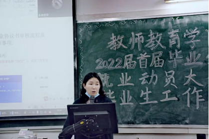 此外谭建生副院长就毕业生目前的就业思想情况进行总结。目前毕业班的同学们分成了三大类:自己已经找到工作单位的;有就业困难还未找到工作单位的;忙着考公考编未能积极主动就业的。针对这些情况提出了三点要求:一是希望同学们听了两位院长的讲话可以提高就业思想,积极就业;二是同学们经过了半年的实习对教学行业已有一定的认识,对自己有信心;三是同学们可以围绕着孩子各个方面来进行创业,多方面拓展就业渠道。希望有单位的同学尽快按照学校流程主动积极上报就业信息,无单位的要积极主动就业,实在是努力了就业难的同学就告诉学院学院会尽力给大家解决困难,不积极就业的要充分提高自己的思想认识,积极就业。