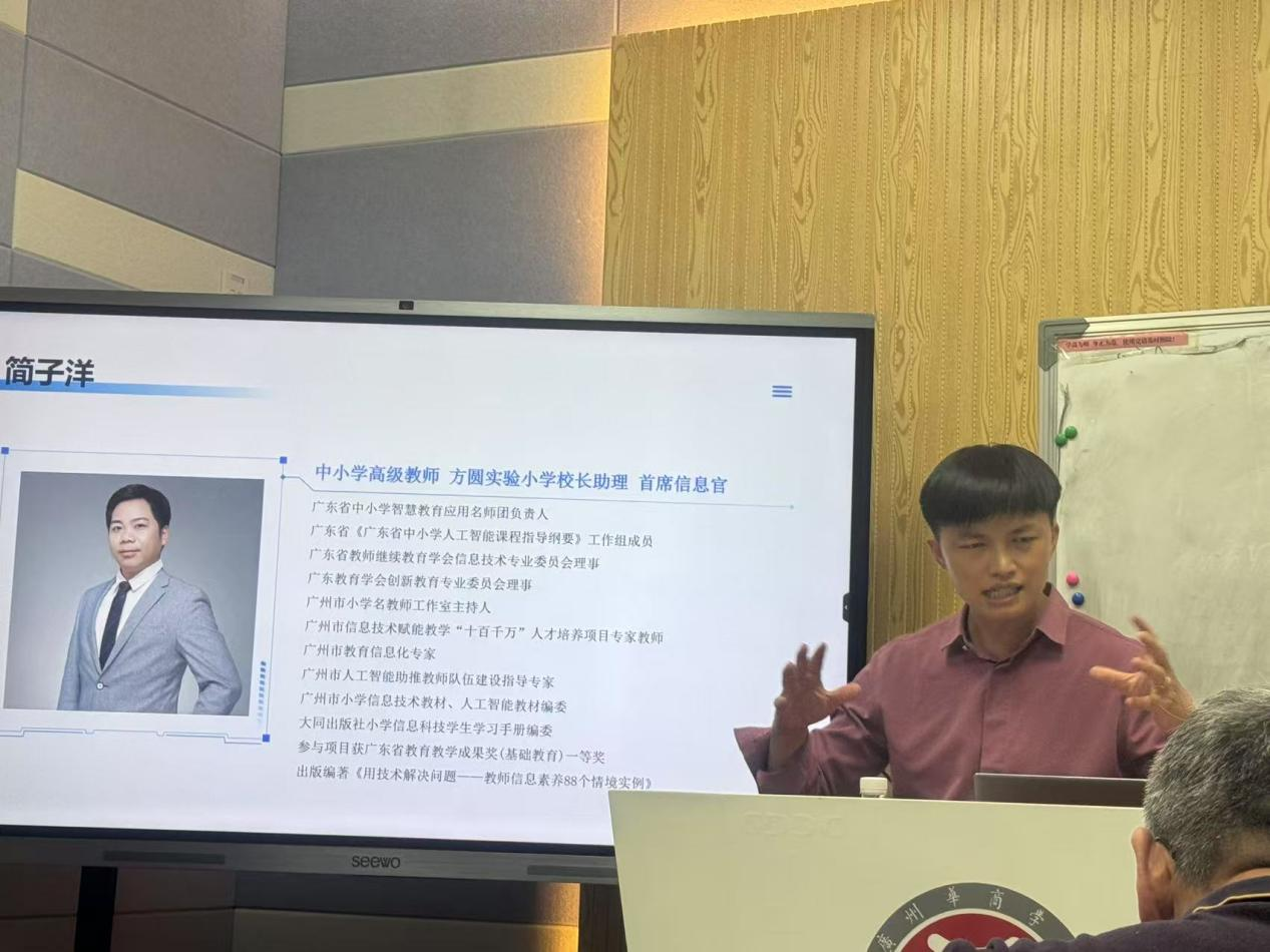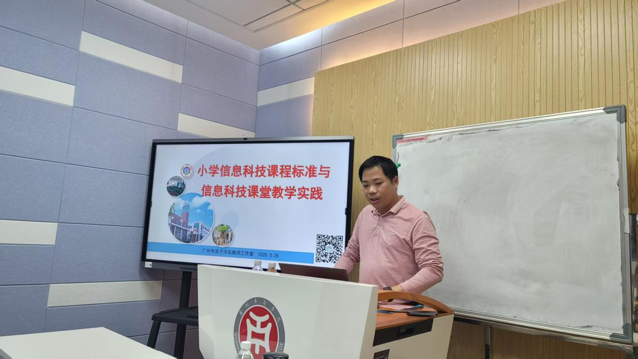 接下来,简子洋老师进行主题报告。报告中,简老师深入剖析了小学信息科技课程的发展历程和重大变革,从课程方案到信息科技课标组的成立,再到教学指南的编写,强调了课程理念的转变和对教学实践的深远影响。他指出,信息科技课程从综合性地方课程上升为国家课程,课程名称从信息技术变为信息科技,教学内容从以技术操作为主转向科学原理的学习,这些变化给教师和学生都带来了新的挑战和机遇。