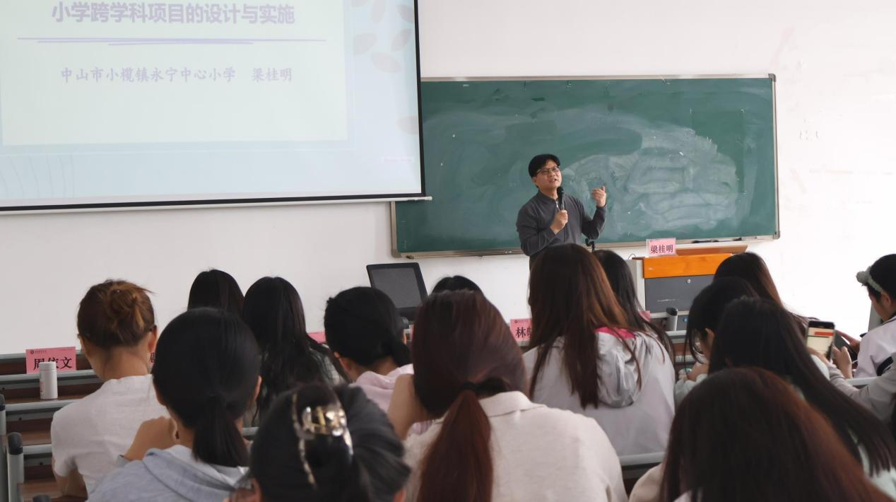 2025年4月8日下午,伟德BV1946肇庆校区6号楼203、205和206教室座无虚席。中山市优秀教师、小学数学科研专家库专家梁桂明以"融创共生:小学跨学科项目设计与实施新路径"为题,为2023级小学教育专业800余名师生带来了一场教育创新的思想盛宴。