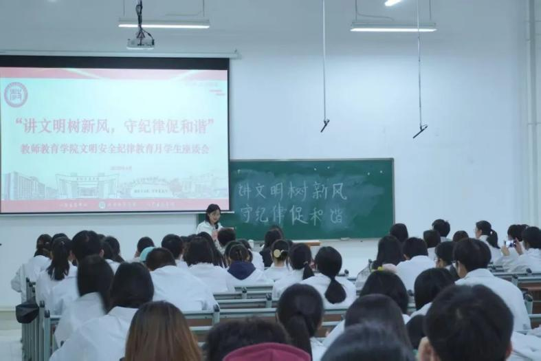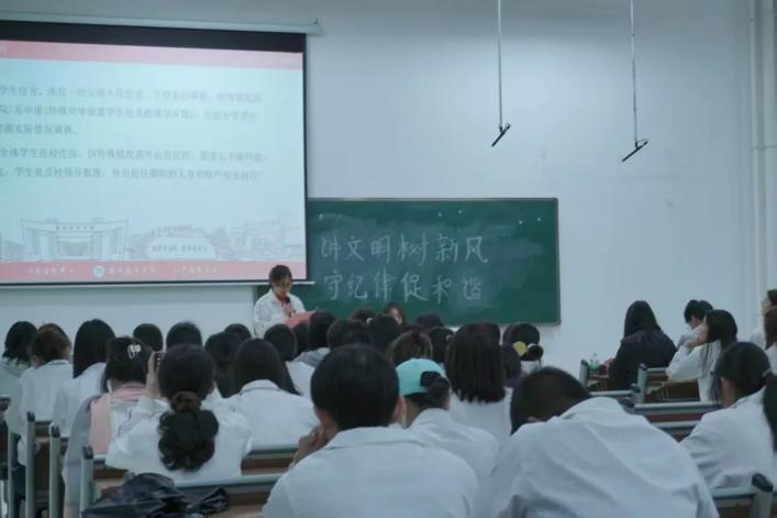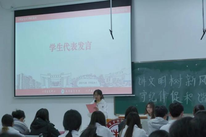 随后,学检部工作人员主要是进行学生手册纪律主题宣讲。她着重强调了文明、安全、纪律作为校园生活基石的重要性,指出其对于维护校园秩序和保障学生成长的深远意义。学院将全力支持此次活动,提供必要指导与帮助,以身作则,坚定决心为创建和谐、文明、优秀的校园环境贡献力量。为此,将成立系课堂文明督察队和考勤检查组,严抓课堂纪律,并开展文明宿舍评比活动,以评选出先进班级,为教育月活动的顺利开展奠定坚实基础。