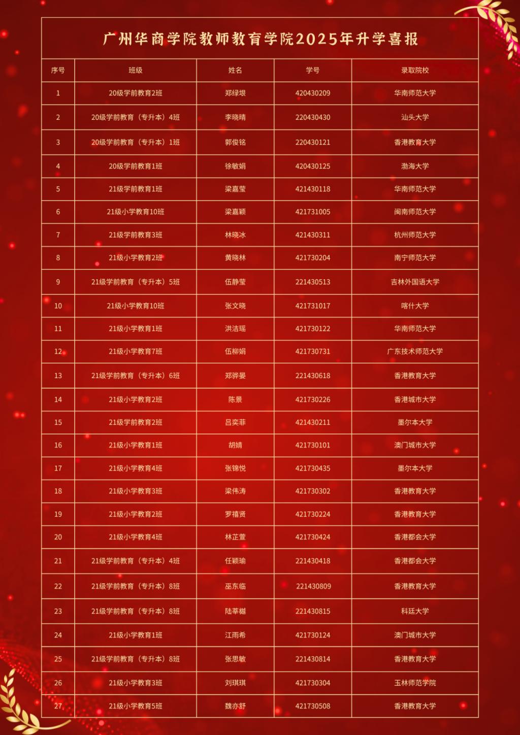 1946伟德国际源自英国2025年毕业生考研再获佳绩。自建院以来,学院深耕学风建设,学子奋发向上。截至目前,2025年毕业生中共有27名同学被知名高校录取,特此向他们表示热烈祝贺!