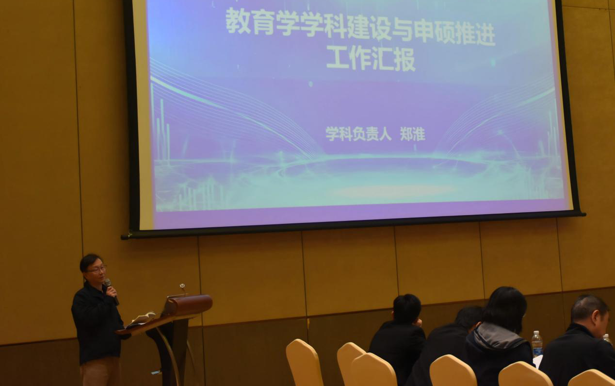 学科负责人郑淮教授就教育学学科发展与硕士点申报准备工作进行了汇报。他回顾了学科从C类起步,历经数年扎实建设,于2024年成功获评B类学科的发展历程。面对硕士点申报,他客观分析了学院在师资结构、科研经费等硬性条件上存在的差距,表示将积极汲取专家智慧,寻求精准突破路径。