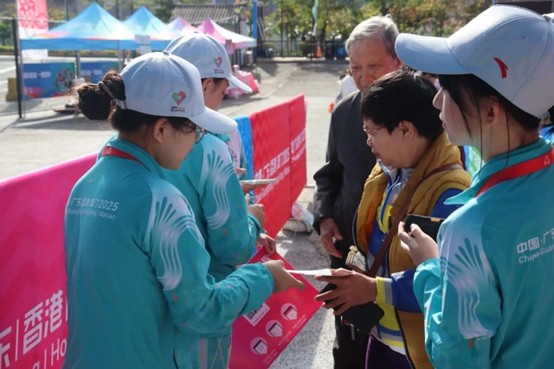 在赛事矩阵中,志愿者分布于赛事引导、后勤保障以及观众服务等关键岗位,用微笑搭建沟通桥梁,用专业筑牢服务防线。从协助完成赛事的物资调配,到为观众提供场馆导航与赛事咨询,从保障赛场的秩序井然,到记录群众的精彩瞬间,他们以细致入微的服务,成为“场馆+城市”双轨服务网中不可或缺的一环。面对赛事期间的高强度工作,志愿者每天超12小时的志愿服务时长,他们始终坚守岗位,将耐心与细致融入每一项服务,用青春力量诠释着“奉献、友爱、互助、进步”的志愿精神,与粤港澳三地志愿者共同绘就了体育精神与湾区同心的壮丽画卷。