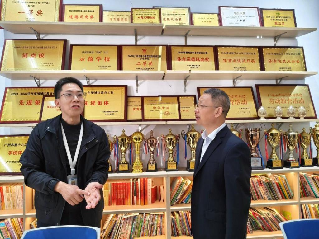 在广州市增城区科教城实验小学,刘伟胜校长亲自带队参观校园,详细介绍了学校的办学理念、"通透" 教育特色及校园文化建设成果。作为广东省基础教育劳动教育学科教研基地实验学校,该校完善的教学设施、浓厚的育人氛围与鲜明的办学特色给考察组留下深刻印象。