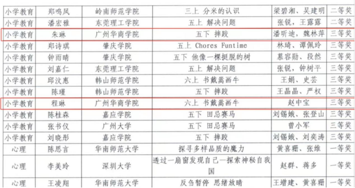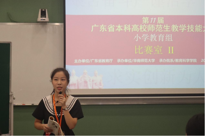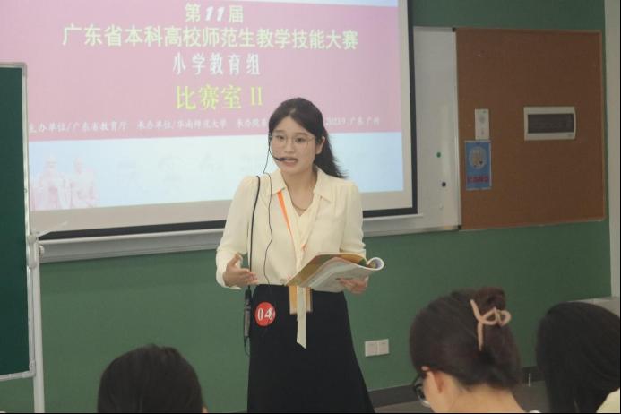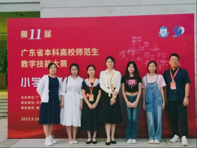 2023年9月24日,由广东省教育厅主办、华南师范大学承办的第十一届广东省本科高校师范生教学技能大赛(小学教育组)决赛在华南师范大学石牌校区举行。经过校内初赛(2022-2023学年第一学期小学教育专业2021级师范生教师职业能力大赛)推选和省赛组委会初选后,我院两名参赛选手:朱琳(指导教师:潘昕迪、魏林苹)和程琳(指导教师:赵中宝)代表学校入围决赛圈,并获得了三等奖的好成绩。首次参赛即获奖,这与我院在人才培养、课程规划和教学管理等方面的领导工作是分不开的,通过本次比赛也充分展现了我院小学教育专业学子扎实的教学基本功和良好的综合素质。