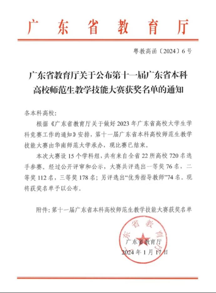 广东省本科高校师范生教学技能大赛是省内规模最大、影响最广的高水平师范生教学技能竞赛。我校学子和东莞理工学院、广州大学、华南师范大学、惠州学院、嘉应学院、岭南师范学院、韶关学院、韩山师范学院等高校学子同台竞技。据悉,大部分参赛选手都是以大四的学生为主,虽然我校本次选派的是大三学生,但是依然承受住了压力,展现了风采,获得了奖项。这里面既有学生积极努力的备战,指导教师的精心训练,更离不开学院王金道院长、谭建生和张博副院长、系主任王符和潘昕迪、专业负责人李志厚等领导老师的高度重视和全力支持。