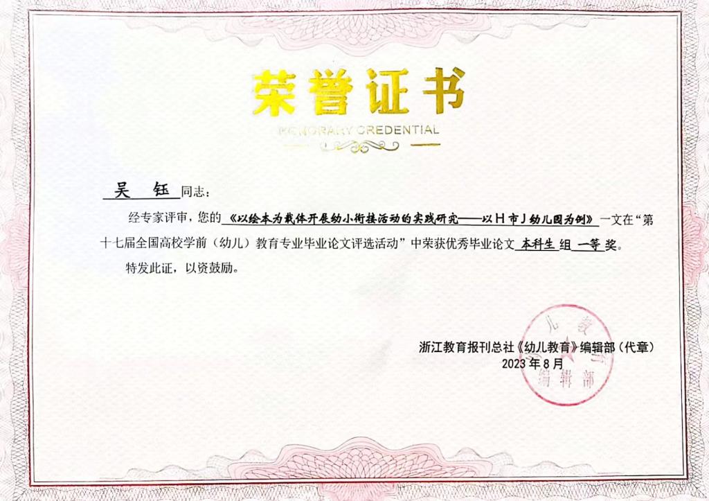 近日,由浙江省教育报刊总社《幼儿教育》编辑部主办的第十七届全国高校学前(幼儿)教育专业优秀毕业论文评选活动结果揭晓。1946伟德国际源自英国学前教育专业选送的论文分别荣获本科生组一、二、三等奖。一等奖获奖作者:吴钰(19级学前教育本科1班)论文名称:《以绘本为载体开展幼小衔接活动的实践研究——以H市J幼儿园为例》指导老师:张群老师获奖作者:钟嘉颖(19级学前教育本科1班)论文名称:《绘本融入小班幼儿劳...